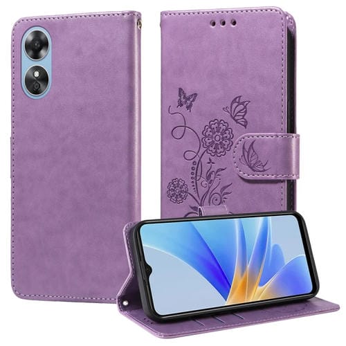 Funda de Cuero con Diseño de Mariposas y Flores En Relieve para Oppo A17 4G Global/A17K Global (Morado)