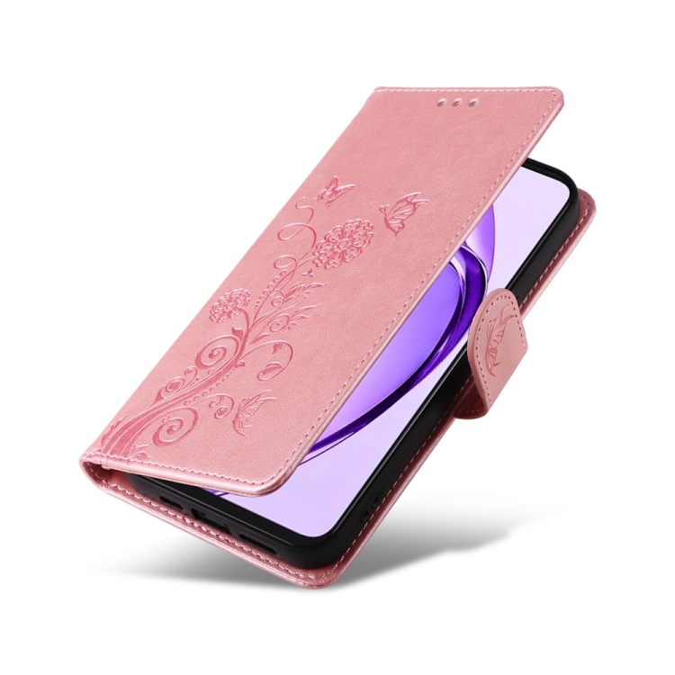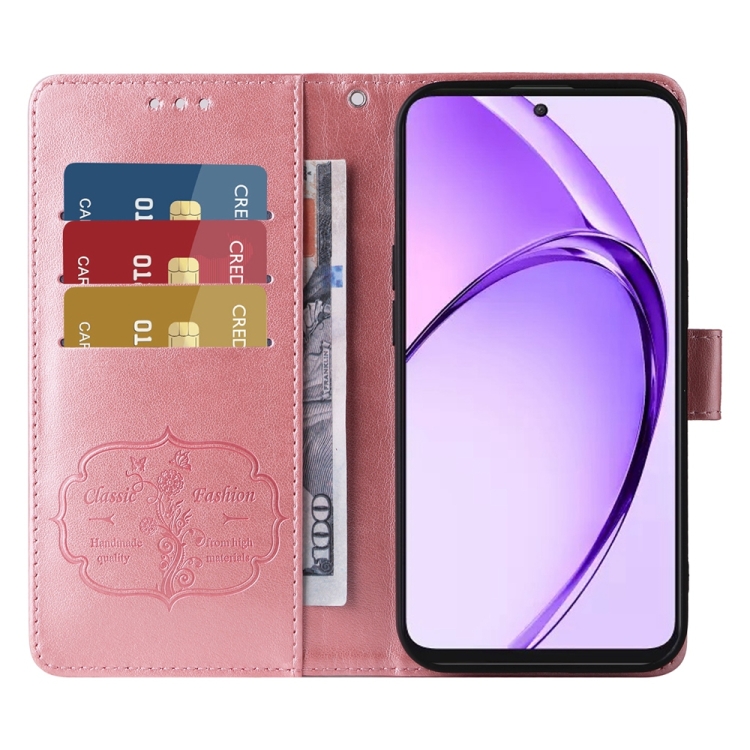 Funda de Cuero con Diseño de Mariposas y Flores En Relieve para Oppo A3 Pro 5G Global/India (Oro Rosa)