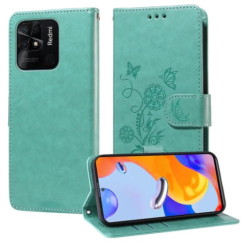 Funda de Cuero con Diseño de Mariposas y Flores En Relieve para Redmi 10C/10 India/10 Power (Verde)
