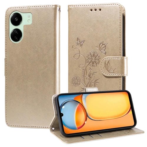 Funda de Cuero con Diseño de Mariposas y Flores En Relieve para Redmi 13C 5G/4G/13R (Dorada)