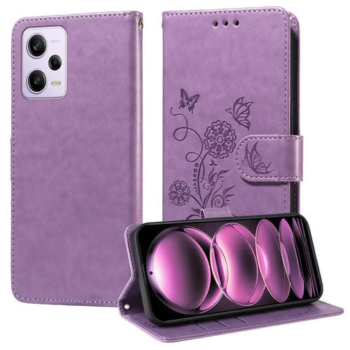 Funda de Cuero con Diseño de Mariposas y Flores En Relieve para Redmi Note 12 Pro 5G (Morado)