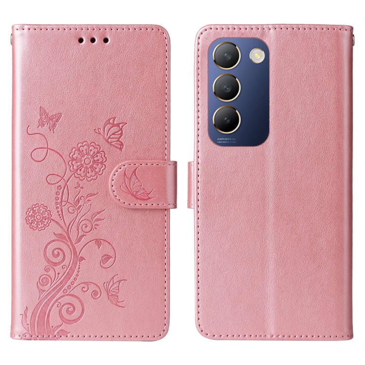 Funda de Cuero con Diseño de Mariposas y Flores En Relieve para Vivo Y100 Idn / Y200E 5G (Oro Rosa)