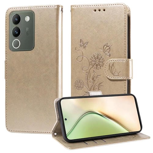 Funda de Cuero con Diseño de Mariposas y Flores En Relieve para Vivo Y200/V29E (Dorada)