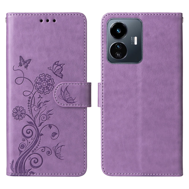 Funda de Cuero con Diseño de Mariposas y Flores En Relieve para Vivo Y77 5G (Morado)