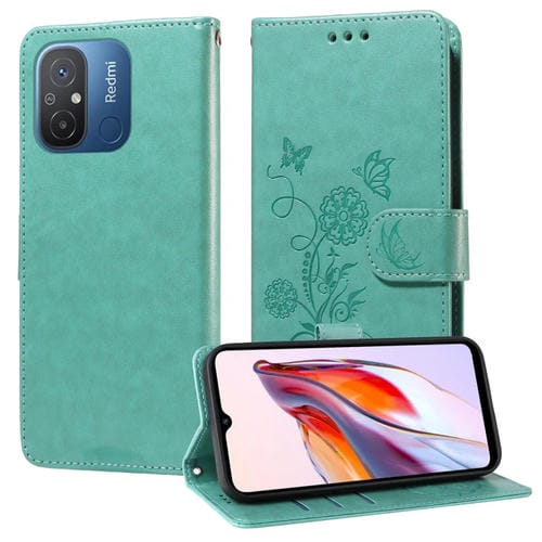 Funda de Cuero con Diseño de Mariposas y Flores En Relieve para Xiaomi Poco C55/Redmi 11A 4G (Verde)