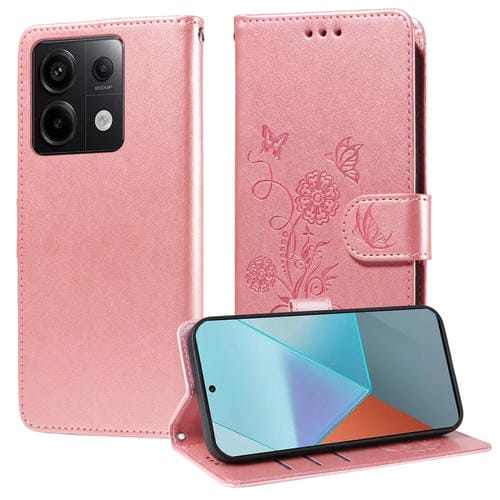 Funda de Cuero con Diseño de Mariposas y Flores En Relieve para Xiaomi Poco X6 5G (Oro Rosa)