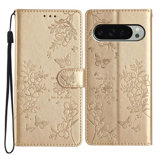 Funda de Cuero Google Pixel 9/9 Pro Diseño Mariposas y Flores (Dorada)