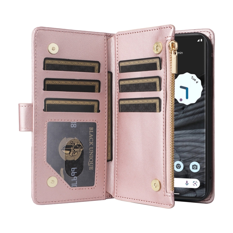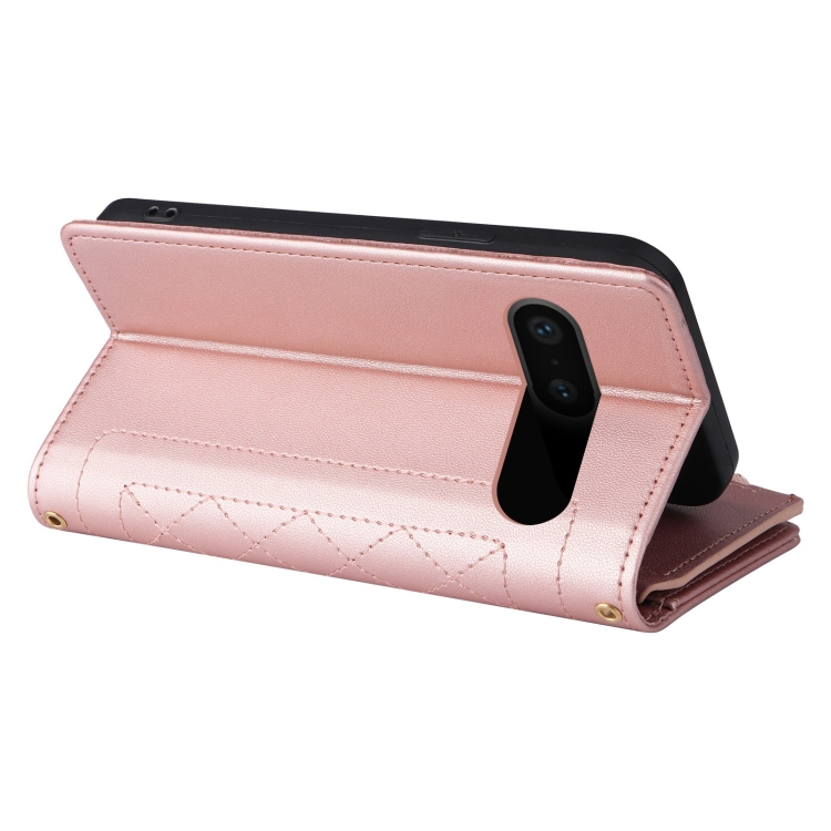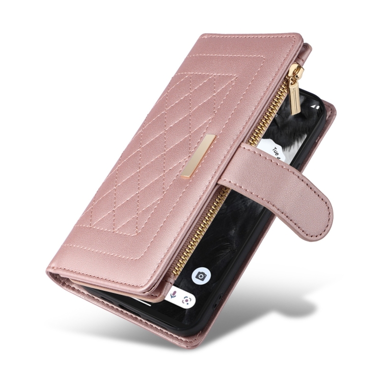 Funda de Cuero con Diseño de Rombos y Billetera Cruzada con Cremallera para Google Pixel 7 (Oro Rosa)
