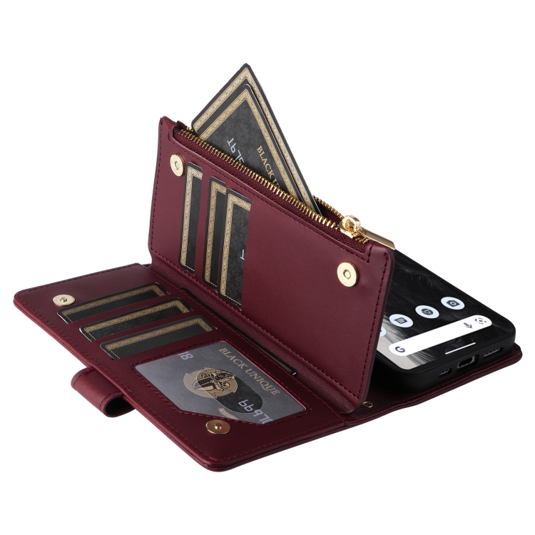 Funda de Cuero con Diseño de Rombos y Billetera Cruzada con Cremallera para Google Pixel 7 (Rojo Vino)