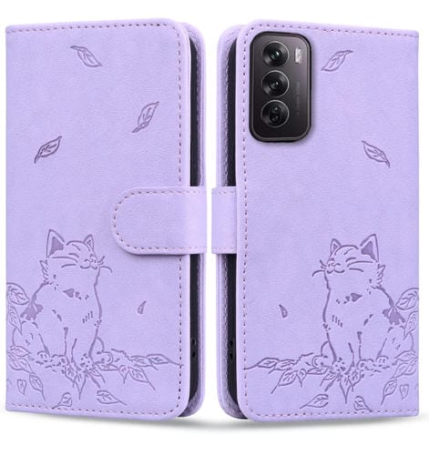 Funda de Cuero con Estampado de Gato Lindo para Oppo Reno12 5G Global (Morado)