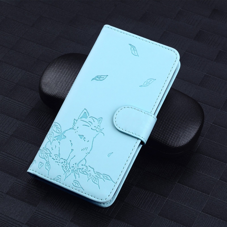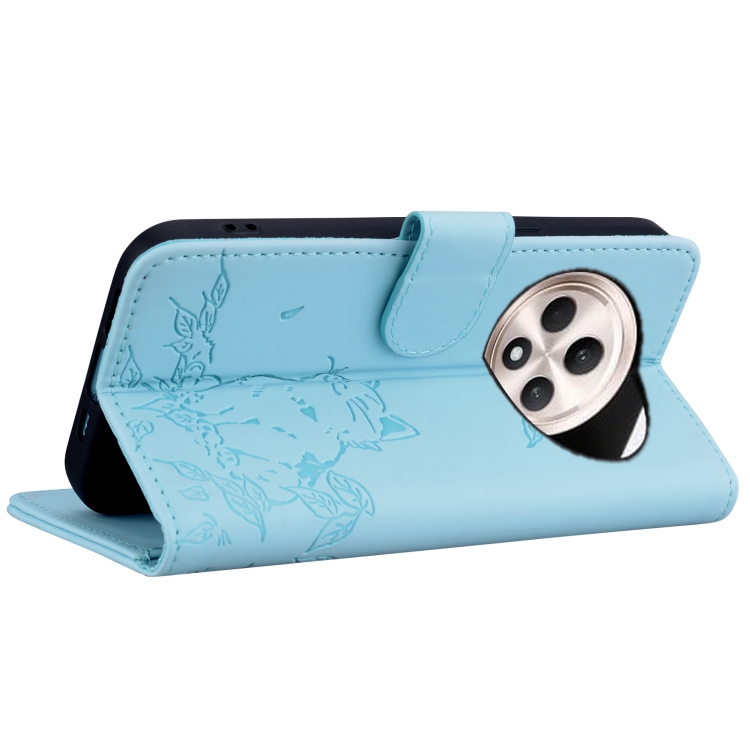 Funda de Cuero con Estampado de Gato para Oppo Reno12 F 5G (Azul Cielo)