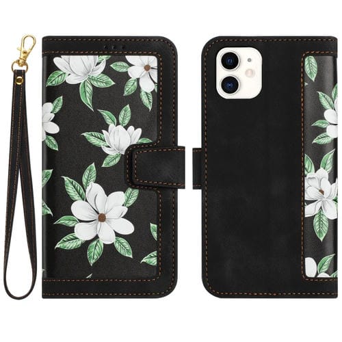 Funda de Cuero iPhone 11 Estampado Floral con Cordón (Negro)