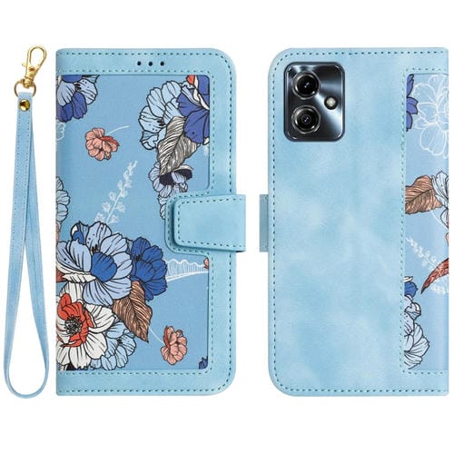 Funda de Cuero con Estampado Floral y Cordón para Motorola Moto G14 (Azul Claro)