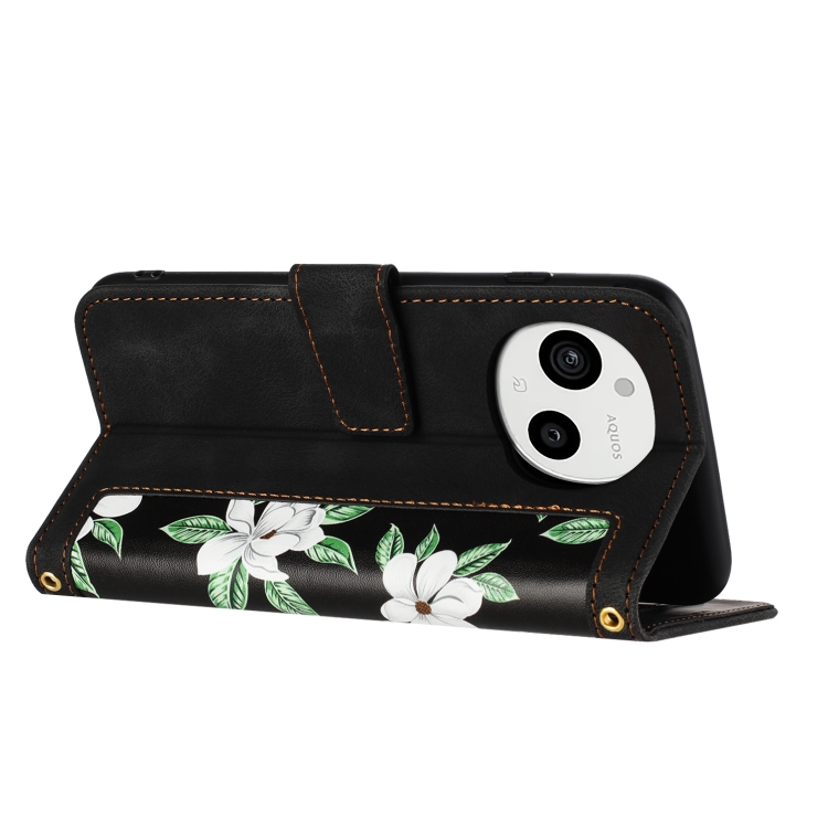Funda de Cuero para Sharp Aquos Sense9 con Estampado Floral y Cordón (Negro)