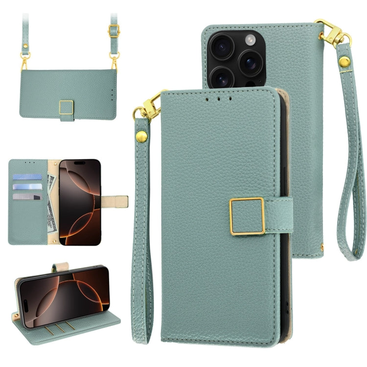 Funda de Cuero con Hebilla Cuadrada y Textura de Lichi Cruzada para iPhone 16 Pro (Azul)