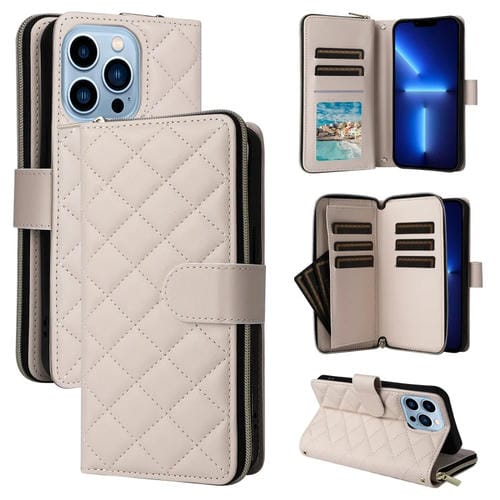 Funda de Cuero con Hebilla de Torre y Cremallera en Forma de Rombo para iPhone 13 Pro Max con Cordón (Beige)