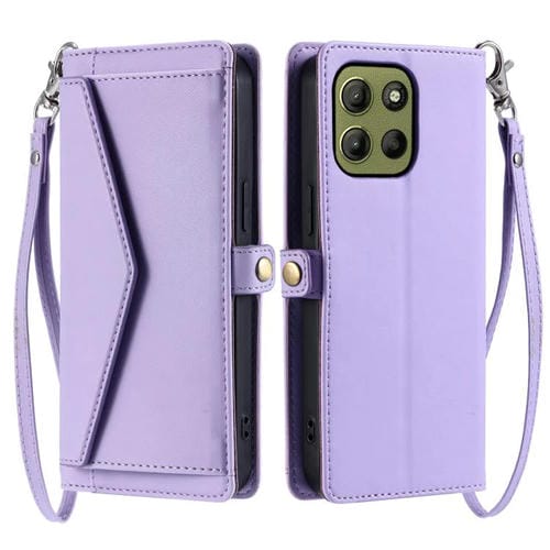 Funda de Cuero para Motorola Moto G15 con Ranura para Tarjetas y Cordón (Morado)