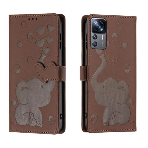 Funda de Cuero con Relieve de Elefante de Dibujos Animados para Xiaomi 12T/12T Pro (Marrón)