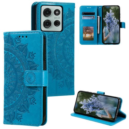 Funda de Cuero con Relieve de Flores para Motorola Moto G75 5G con Cordón (Azul)