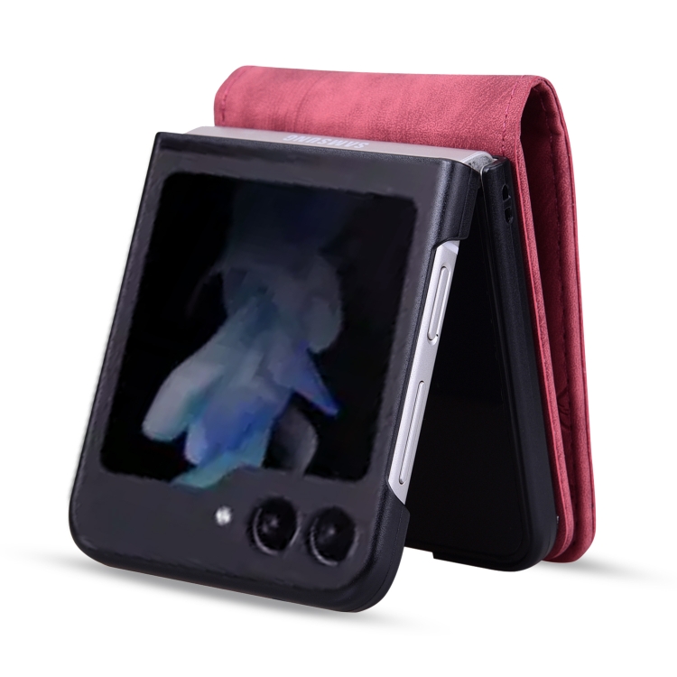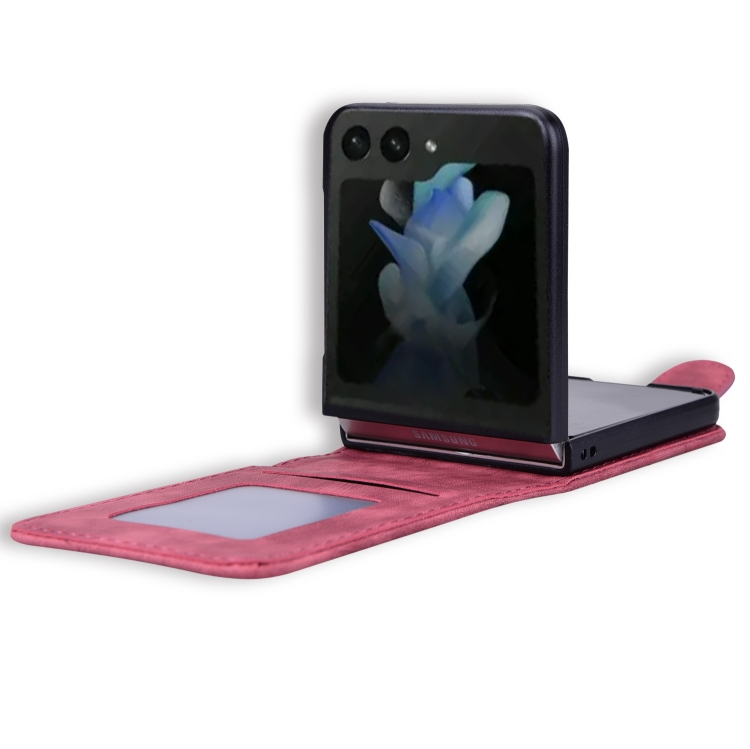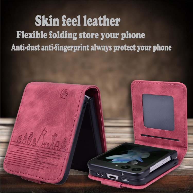 Funda Cuero con Relieve Gato Sakura para Samsung Galaxy Z Flip5 (Rojo Vino)