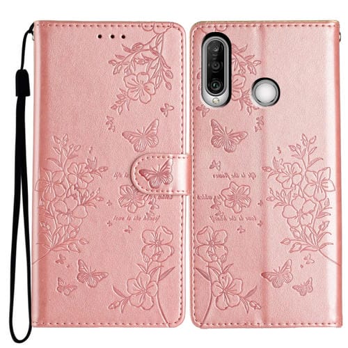 Funda de Cuero para Huawei Y6P con Relieve de Mariposa y Flor (Oro Rosa)