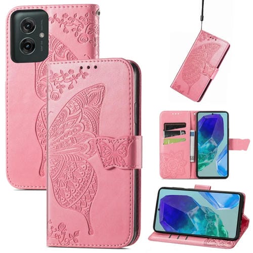 Funda de Cuero con Relieve Mariposa y Flor para Motorola Moto G55 (Rosa)