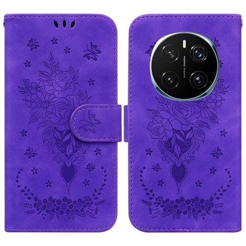 Funda de Cuero con Relieve Mariposa y Rosa para Honor Magic7 Pro (Morada)