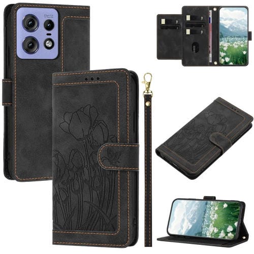 Funda de Cuero con Relieve de Tulipanes para Motorola Edge 50 Pro con Cordón (Negro)