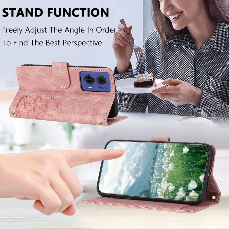 Funda de Cuero con Relieve de Tulipanes para Motorola Moto G85 con Cordón (Rosa)