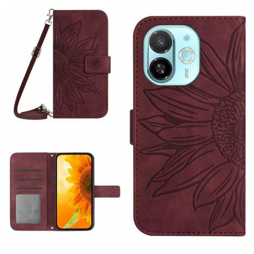 Funda de Cuero con Tapa para Teléfono Tecno Spark 30C 5G con Diseño de Girasol (Rojo Vino)