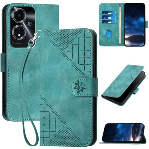 Funda de Cuero con Tapa y Cordón para Oppo A59 5G Yx0080 con Diseño En Relieve de Mariposa y Cuadrícula (Azul Claro)