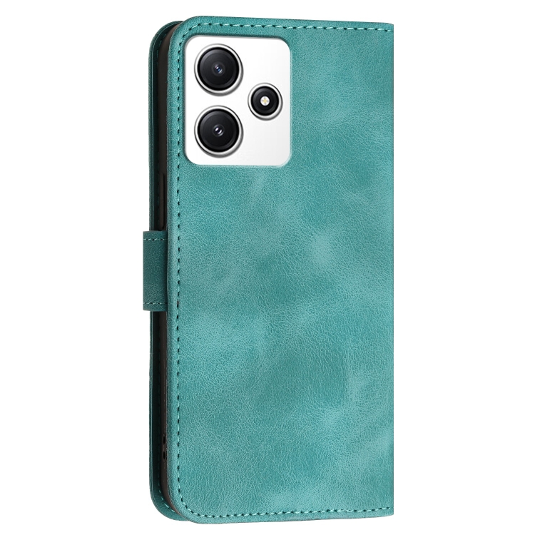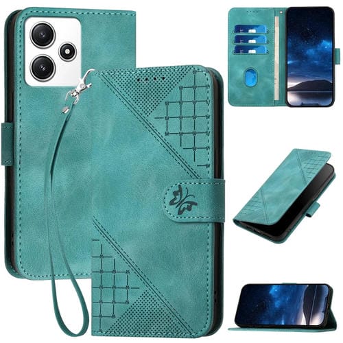 Funda de Cuero con Tapa y Cordón para Redmi 12 5G Yx0080 con Diseño de Mariposa En Relieve y Cuadrícula (Azul Claro)