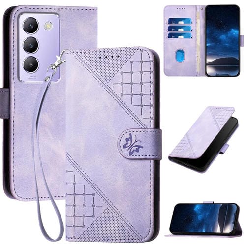 Funda de Cuero con Tapa y Cordón para Vivo T3 5G Idn Yx0080 con Diseño En Relieve de Mariposa y Cuadrícula (Morado Claro)