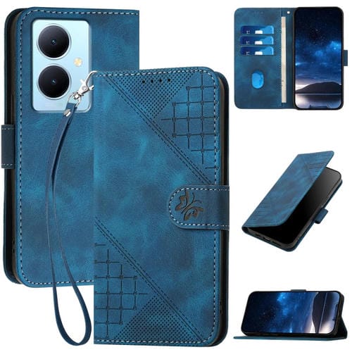 Funda de Cuero con Tapa y Cordón para Vivo Y78+ 5G Global / V29 Lite Yx0080 con Diseño En Relieve de Mariposa y Cuadrícula (Azul Oscuro)