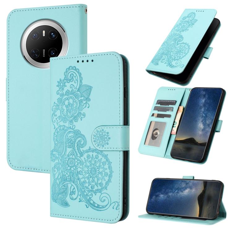 Funda de Cuero con Tapa y Diseño Flor de Datura en Relieve para Huawei Mate 70 (Azul Claro)