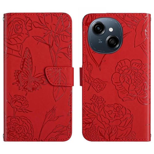 Funda de Cuero con Tapa y Mariposas en Relieve para Tecno Pop 9 4G/Spark Go 2025 4G (Rojo)