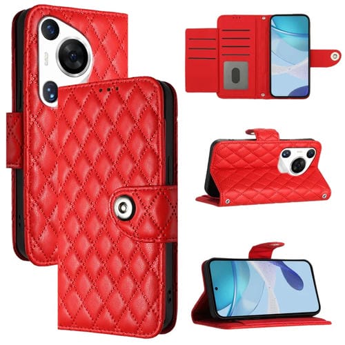 Funda de Cuero con Tapa y Textura Rombal para Huawei Pura 70 Pro con Cordón (Rojo)