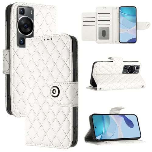 Funda de Cuero con Tapa y Textura Rómbica para Huawei P60/P60 Pro con Cordón (Blanca)