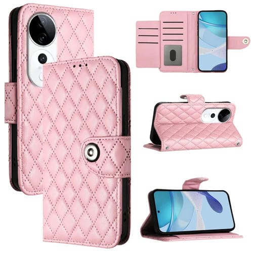 Funda de Cuero con Tapa y Textura Rómbica para Teléfono Vivo S19 Pro con Cordón (Rosa)