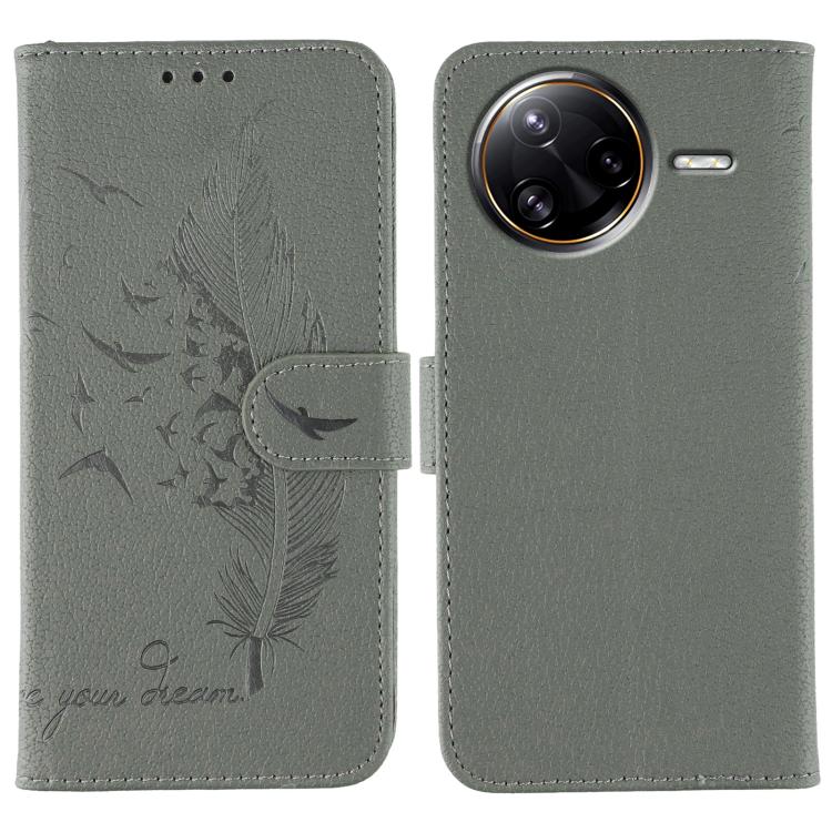 Funda de cuero con textura de lichi y estampado de plumas para Xiaomi Poco F7 Ultra / Redmi K80 Pro (gris)