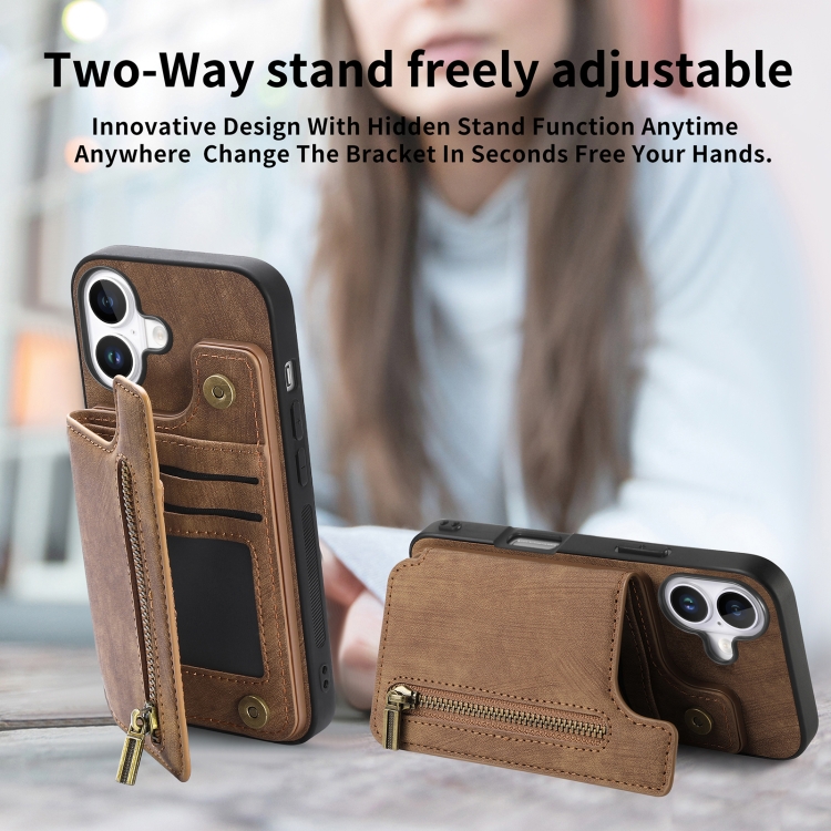 Funda de Cuero Estilo Retro para iPhone 16 con Cremallera y Billetera (Marrón)