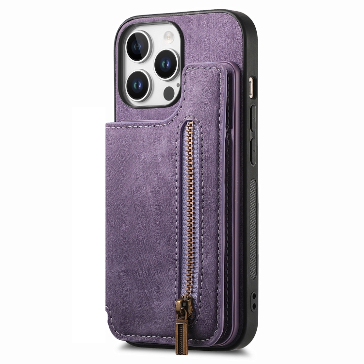 Funda de Cuero Estilo Retro para iPhone 16 Pro Max con Cremallera y Billetera (Morado)