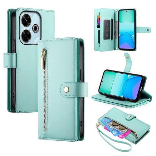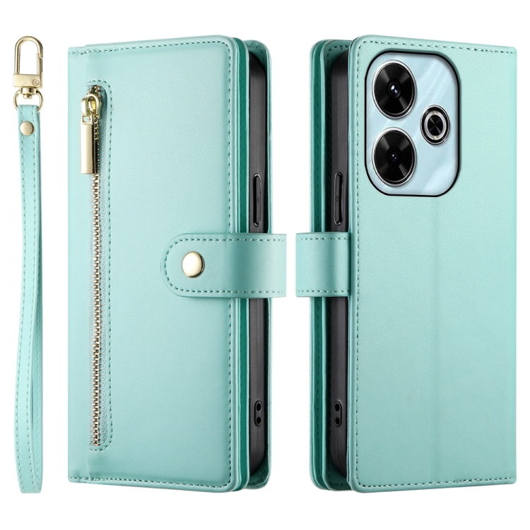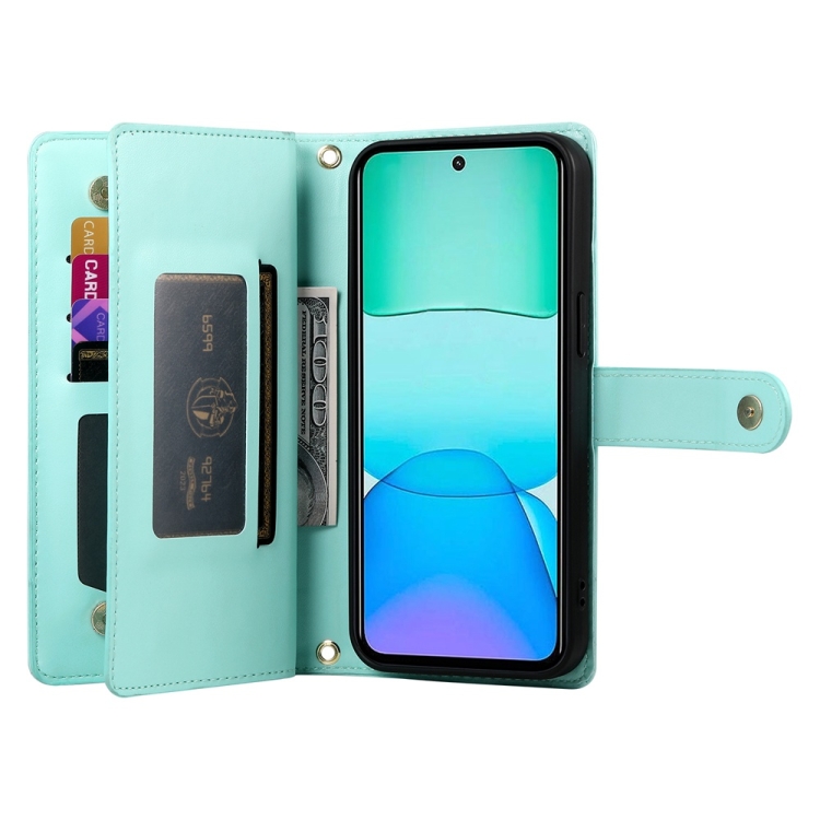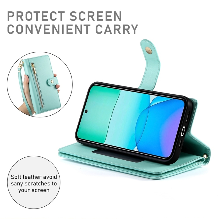 Funda de Cuero para Teléfono con Nueve Ranuras para Tarjetas y Cremallera para Redmi 13 (Verde Menta)