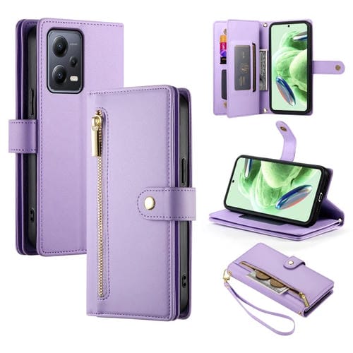 Funda de Cuero para Teléfono con Nueve Ranuras para Tarjetas y Cremallera para Redmi Note 12 5G/Xiaomi Poco X5 (Morado)