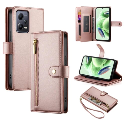 Funda de Cuero para Teléfono con Nueve Ranuras para Tarjetas y Cremallera para Redmi Note 12 5G/Xiaomi Poco X5 (Rosa)