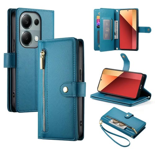 Funda de Cuero para Teléfono con Nueve Ranuras para Tarjetas y Cremallera para Redmi Note 13 Pro 4G/Xiaomi Poco M6 Pro (Azul)