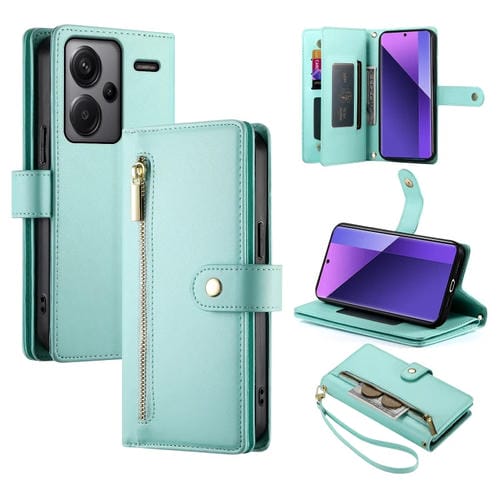 Funda de Cuero para Teléfono con Nueve Ranuras para Tarjetas y Cremallera para Redmi Note 13 Pro+ (Verde Menta)