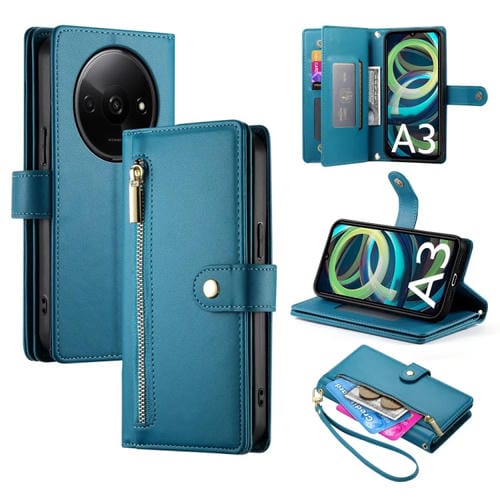 Funda de Cuero para Teléfono Redmi A3 con Nueve Ranuras para Tarjetas y Cremallera (Azul)