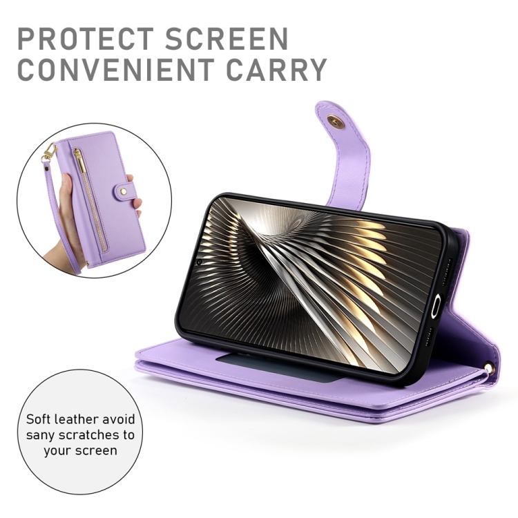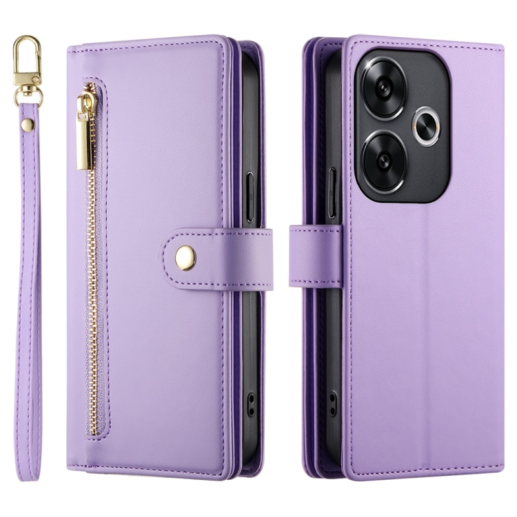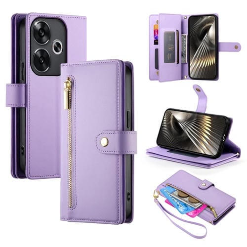 Funda de Cuero para Teléfono Redmi Turbo 3 con Nueve Ranuras para Tarjetas y Cremallera (Morado)