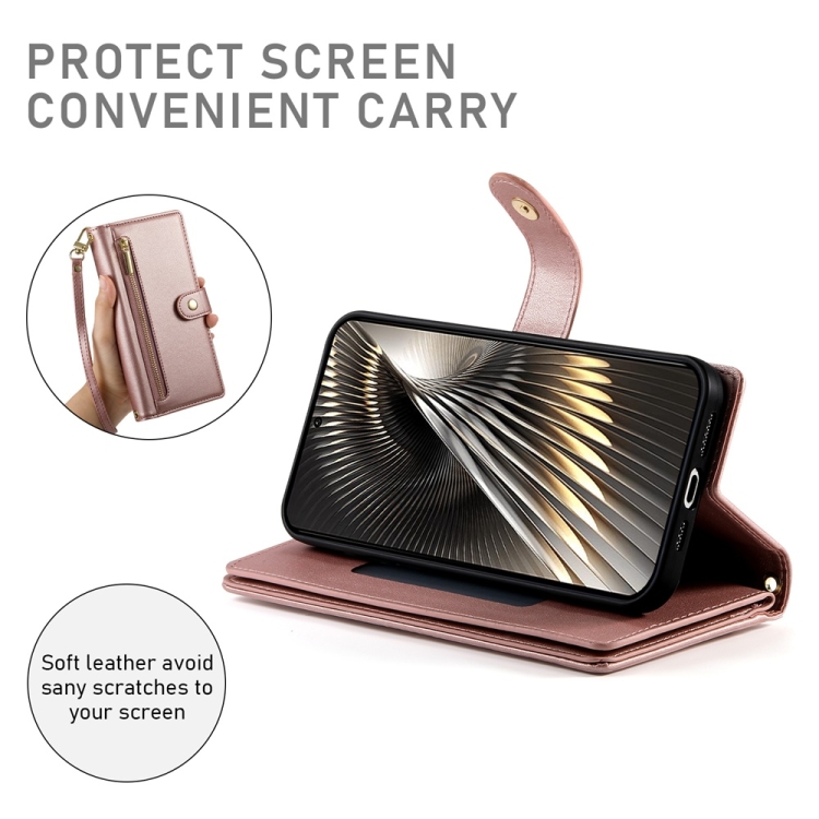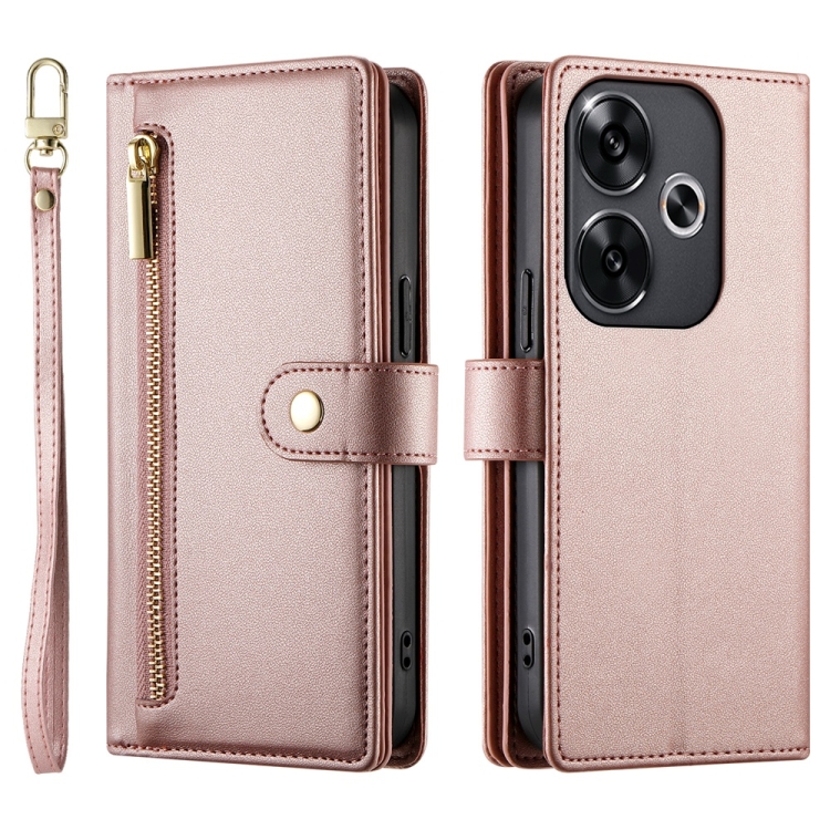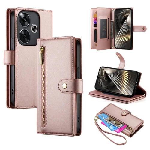 Funda de Cuero para Teléfono Redmi Turbo 3 con Nueve Ranuras para Tarjetas y Cremallera (Rosa)